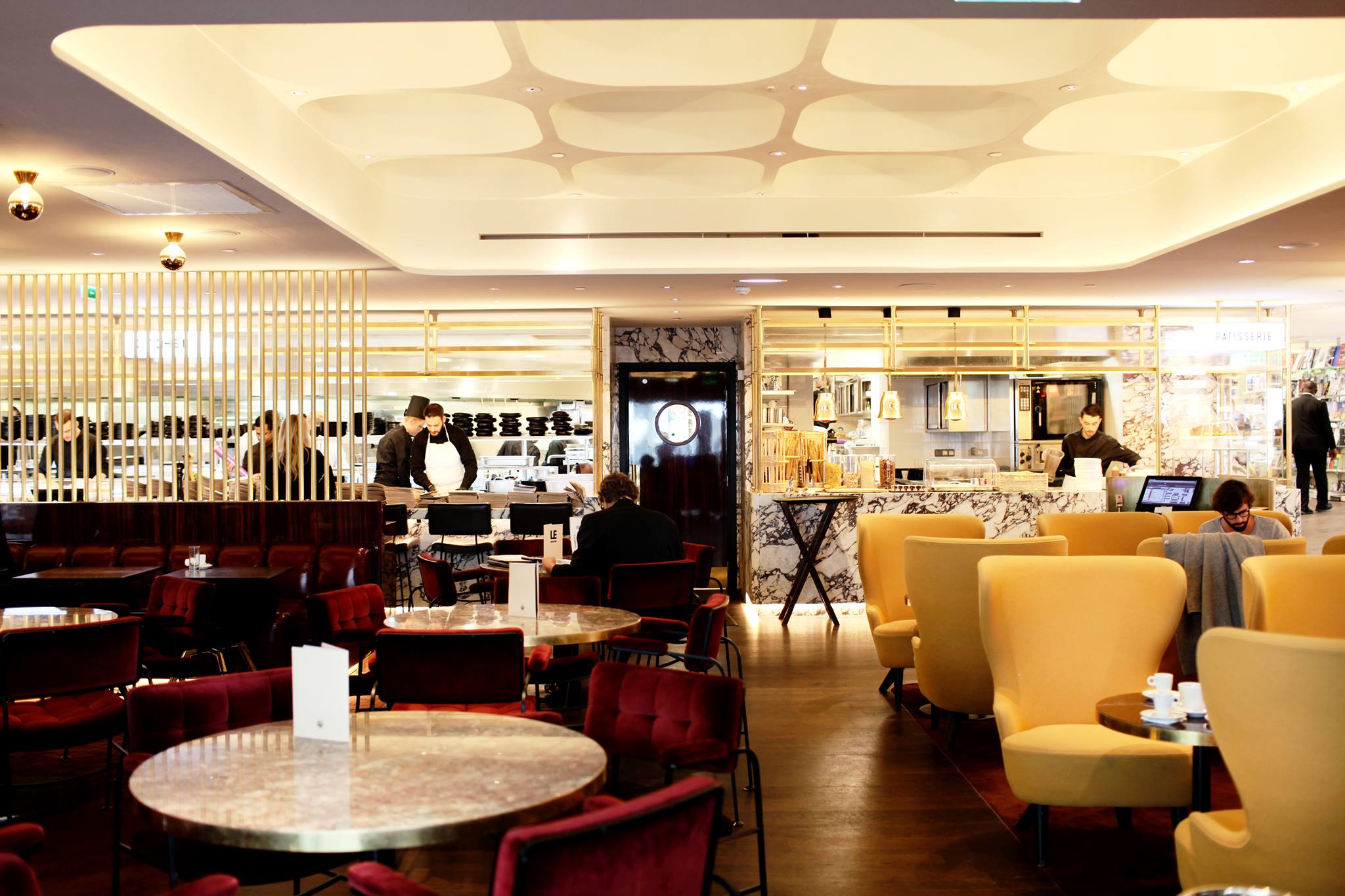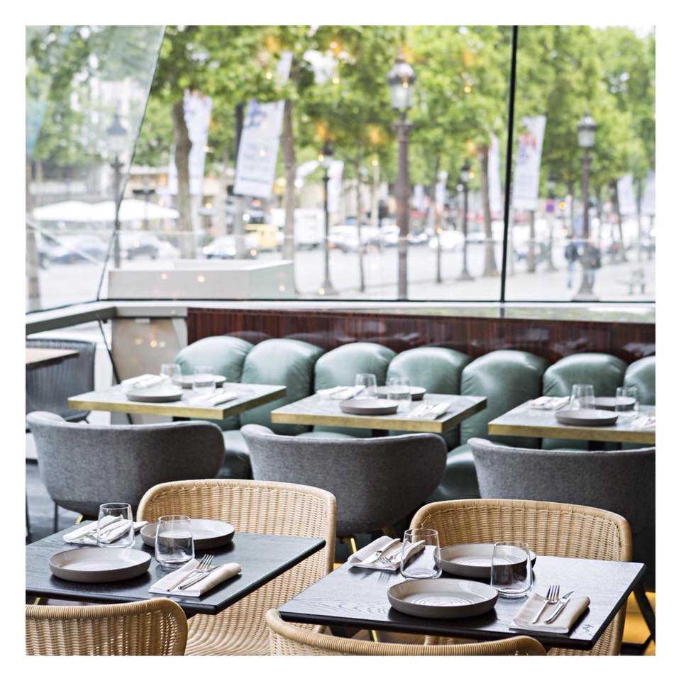 Back in time at the Drugstore, you could meet Serge Gainsbourg during his cigarettes shopping at 1.A.M. between the Parisian night owls… Today, you can go there to buy a book, find a new High Tech gadget and, most importantly, book a table a LE Drugstore, trendy and cosmopolitan restaurant, « place-to-be » in Paris. With its XXL terrace facing Champs-Elysées and its design restaurant room by Tom Dixon, LE Drugstore welcomes you all day long for a breakfast, a gourmet lunch, a quick sandwich, a tea-time, a cocktail on the terrace or a friendly diner. We love the warm atmosphere with its luminous bar, its open-plan kitchen with « Kitchen » and « Cakes » corners looking like New York’s Food Halls, comfortable velvet armchairs and leather, marble, brass and stone everywhere. When discovering the menu by star-studded Chef Eric Frechon (Le Bristol, le Mini Palais), the choice is really difficult ! We suggest that you start with some « Finger Food » plates to share between Swiss cheese and old Parmesan’s Madeleines for the Cheezy addicts, prawns beignets, hummus and the amazing Corn Tempura sprinkled with tandoori, an original creation, really addictive. All day long, the restaurant serves traditional dishes between burgers, tartars, oysters (really fresh, big and delicious), club sandwich and salads. For a a more sophisticated lunch or diner, you will love the innovative menu, suggesting the same ingredients cooked in a raw or boiled version, according to your wishes. Our recommendations ? The large prawns carpaccio, the breaded chicken with peanuts/corn flakes/cajun dip, the funny Signature Fish & Chips where the fries directly cover the fish or the selection of « Meat Collection » (Irish Angus Beef, Wagyu Beef from Japan…) Above all, save room for a dessert, especially for a Signature « millefeuille », a floating island with pink pralines, some strawberries with meringue and our favorite one : the half fresh and melting mango, roasted with caramel, served with some fresh passion fruit and a yogurt sorbet, perfect ! Special mention for the young and available staff. A++++++