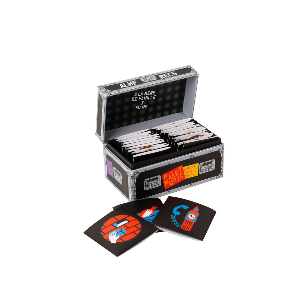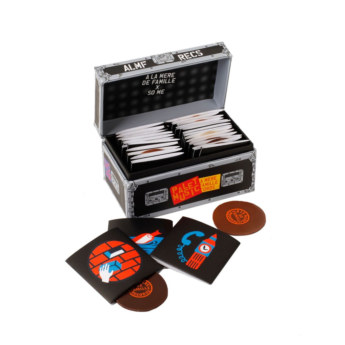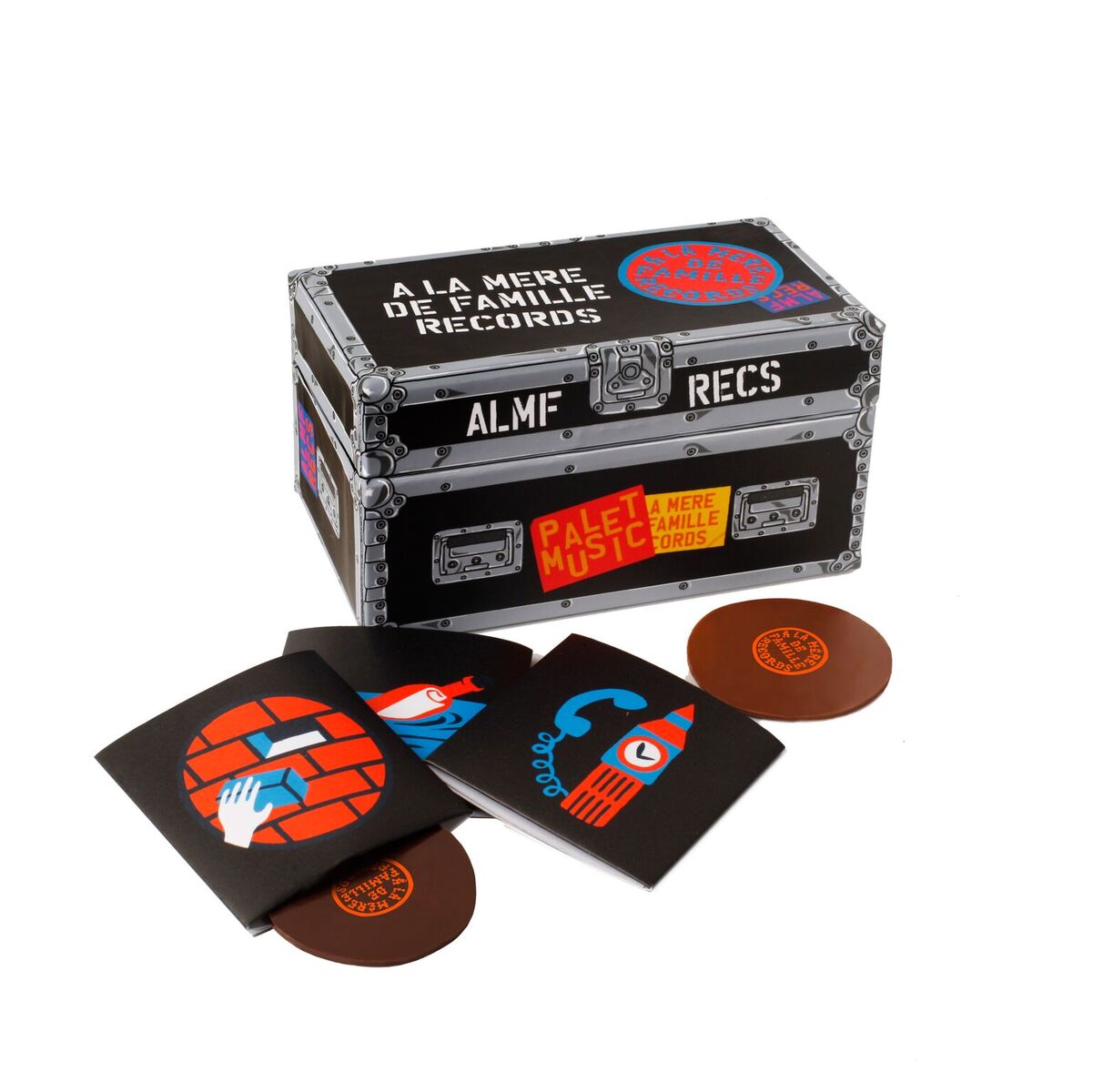 Great news, we just found the perfect gift for music and chocolate lovers ! In fact, A la mère de famille, oldest chocolate factory in Paris, collaborates with SO ME (graphic designer, video director and DJ from Ed Banger Records) and introduces a lovely « A la mère de famille Records » mini flight case containing several vinyl records made of chocolate. It features 28 « Montmartre pucks » turned into really gourmet records made of crunchy hazelnut covered with dark chocolate, crispy nougatine covered with white chocolate and melting caramel covered with milk chocolate. As for the vinyl’s covers, illustrated by SO ME who already produced music videos for Justice, Kid Cudi and A-Trak, they are adorned with colorful drawings (Ed Banger spirit) hinting at legendary songs between Daft Punk, Michael Jackson and The Police for example. Once closed, the mini flight case can easily be used as an interior decoration element ! Price : 29 euros