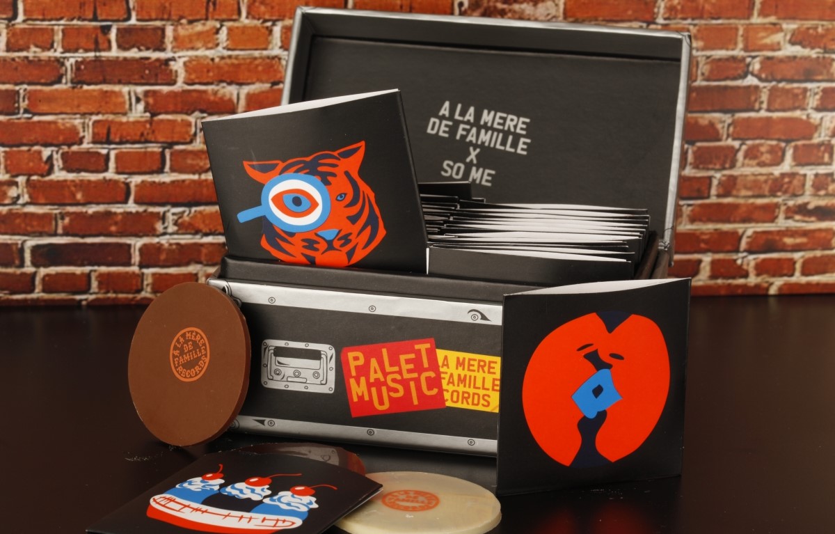 Bonne nouvelle, nous venons de vous dénicher le cadeau idéal pour un mélomane accro au chocolat ! En effet, A la mère de famille, plus ancienne chocolaterie de Paris, collabore avec SO ME (graphiste, réalisateur et producteur du label Ed Banger) et dévoile une adorable mallette « A la mère de famille Records » qui renferme de nombreux vinyles en chocolat. Au programme, 28 « palets Montmartre » transformés en 45 tours ultra-gourmands avec leur noisette croustillante enrobée de chocolat noir, nougatine croquante enrobée de chocolat blanc et caramel fondant enrobé de chocolat au lait. Quant aux pochettes des vinyles, illustrées par SO ME qui a déjà clippé pour Justice, Kid Cudi ou encore A-Trak, elles s’ornent de dessins hauts en couleur (esprit Ed Banger oblige) et font allusion à des morceaux cultes entre Daft Punk, Michael Jackson ou encore The Police. Une fois refermé, le mini flight case peut rapidement se transformer en objet de décoration intérieure incontournable ! Prix : 29 euros.