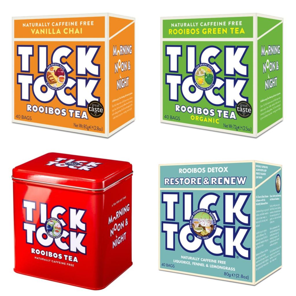 Tick Tock Tea (UK), plus ancienne marque de Rooïbos (the oldest Rooibos brand), Green Tea, Lemon & Ginger (citron/gingembre)…, à boire chaud ou en cocktail (for drinking warm or in cocktails) 2.95 euros la boîte de 40 sachets
