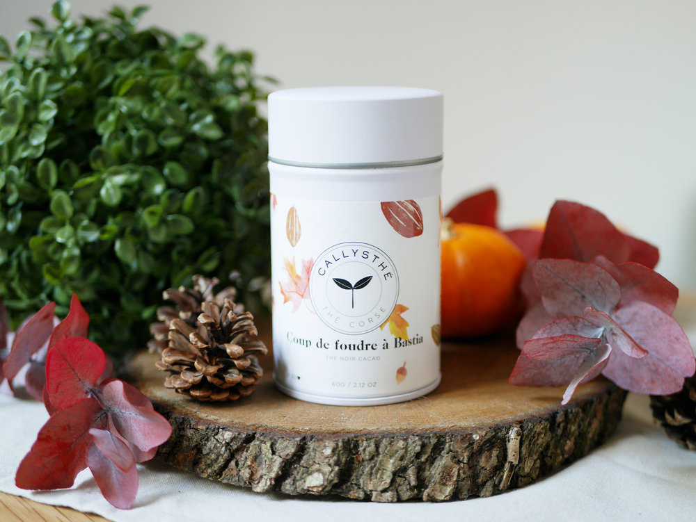 Thé Corse « Coup de foudre à Bastia » par Callysthé (« Love at first sight in Bastia » Corsica tea) – Thé ultra-gourmand et réconfortant à la saveur cacaotée (really gourmet and heartwarming tea tasting like chocolate) – Mélange de thé noir d’Inde, cacao du Ghana, menthe, piment de Cayenne et nepita corse (mix of India black tea, Ghana cocoa, mint, Cayenne pepper and Corsica nepita) – 15 euros –