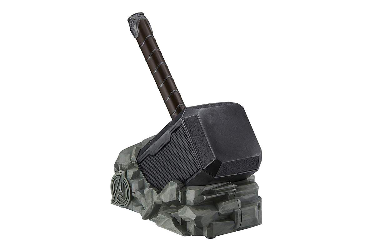 Enceinte Bluetooth (Bluetooth speaker system) inspirée de l’univers de Thor et son marteau légendaire (inspired by Thor and his legendary hammer) – L’enceinte s’illumine lorsque la poignée du marteau est saisie (the speaker lights up when the hammer’s grip is taken) – 40 euros