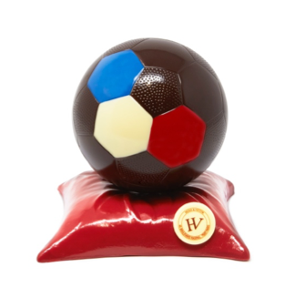 Sur commande avant le 1er juin, en ligne ou en boutique (40 boulevard Raspail 75007) du 1er juin au 14 juillet, découvrez le ballon en chocolat bleu, blanc, rouge d’Hugo & Victor. Ce dernier célèbre bien évidemment l’équipe de football féminine de France qui, on l’espère, remportera la coupe du Monde 2019 se déroulant à domicile. Le ballon tricolore de 16 cm se compose de chocolat noir 70%, d’une poudre de framboise pour la couleur rouge, de spiruline pour la couleur bleu et de chocolat blanc. Une création audacieuse sans aucun arôme de synthèse ni colorant ou autre additif chimique. (49 euros le ballon sur son coussin)