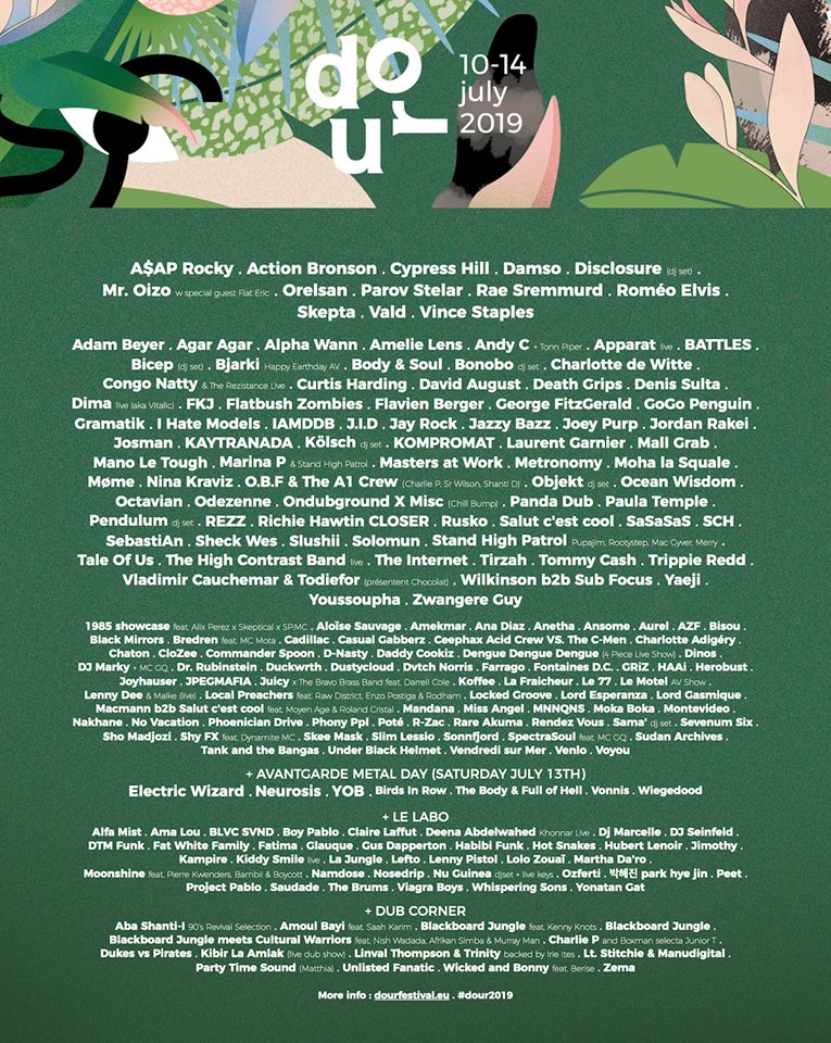 Quels artistes ? A$AP Rocky, Action Bronson, Cypress Hill, Damso, Disclosure, Orelsan, Roméo Elvis, Rae Sremmurd, Skepta, Vald, Vince Staples, Alpha Wann, FKJ, Flatbush Zombies, IAMDDB, J.I.D., Jay Rock, Jazzy Bazz, Joey Purp, Josman, Kaytranada, Metronomy, Moha la Squale, Nina Kraviz, Octavian, SCH, Sheck Wes, The Internet, Trippie Redd, Yaeji, Youssoupha, Aloïse Sauvage, Dinos, Duckwrth, Koffee, Lord Esperanza, Phony Ppl, Slim Lessio, Venlo, Kiddy Smile, Lolo Zouai, Fatima…