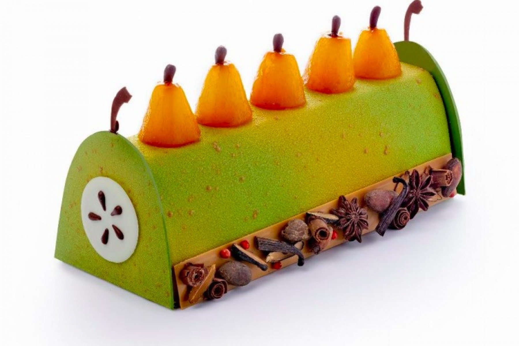 Sans Gluten – Mousse sudashi (agrume vert et sauvage japonais) – confit poire et citron – biscuit moelleux citron jaune – sirop de poire – croustillant amande et chocolat dulce – crémeux épicé spéculoos et pain d’épices – anis étoilé. Par Jimmy Mornet // Gluten-free – Sudashi mousse (green and wild Japanese citrus fruit) – pear and lemon confit – soft yellow lemon biscuit – pear syrup – crispy almond and dulce chocolate – spicy speculoos cream and gingerbread – star anise. By Jimmy Mornet