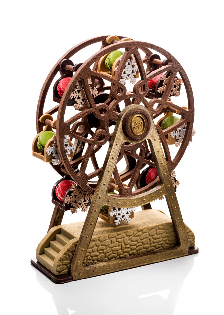 Grande roue entièrement réalisée en chocolat – Nacelles garnies de macarons, nougats, bonbons de chocolats ou caramels – Socle composé d’une bûche pain d’épices – citron – fruits de Noël (Oranges, pruneaux, griottes, gingembre, figues, abricots confits) – pistaches – amandes grillées – Par Pierre Hermé // Big wheel entirely made of chocolate – Nacelles filled with macaroons, nougats, chocolate candies or caramels – Base composed of a log gingerbread – lemon – Christmas fruit (oranges, prunes, morello cherries, ginger, figs, candied apricots) – pistachios – toasted almonds – By Pierre Hermé