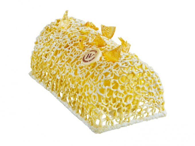 Coque dentelle en chocolat blanc réalisée à la main – biscuit au jus de yuzu – cream cheese au jus de citron – crémeux yuzu – meringue croquante – citron jaune confit // Handmade white chocolate lace shell – yuzu juice biscuit – lemon juice cream cheese – yuzu cream cheese – crunchy meringue – candied lemon