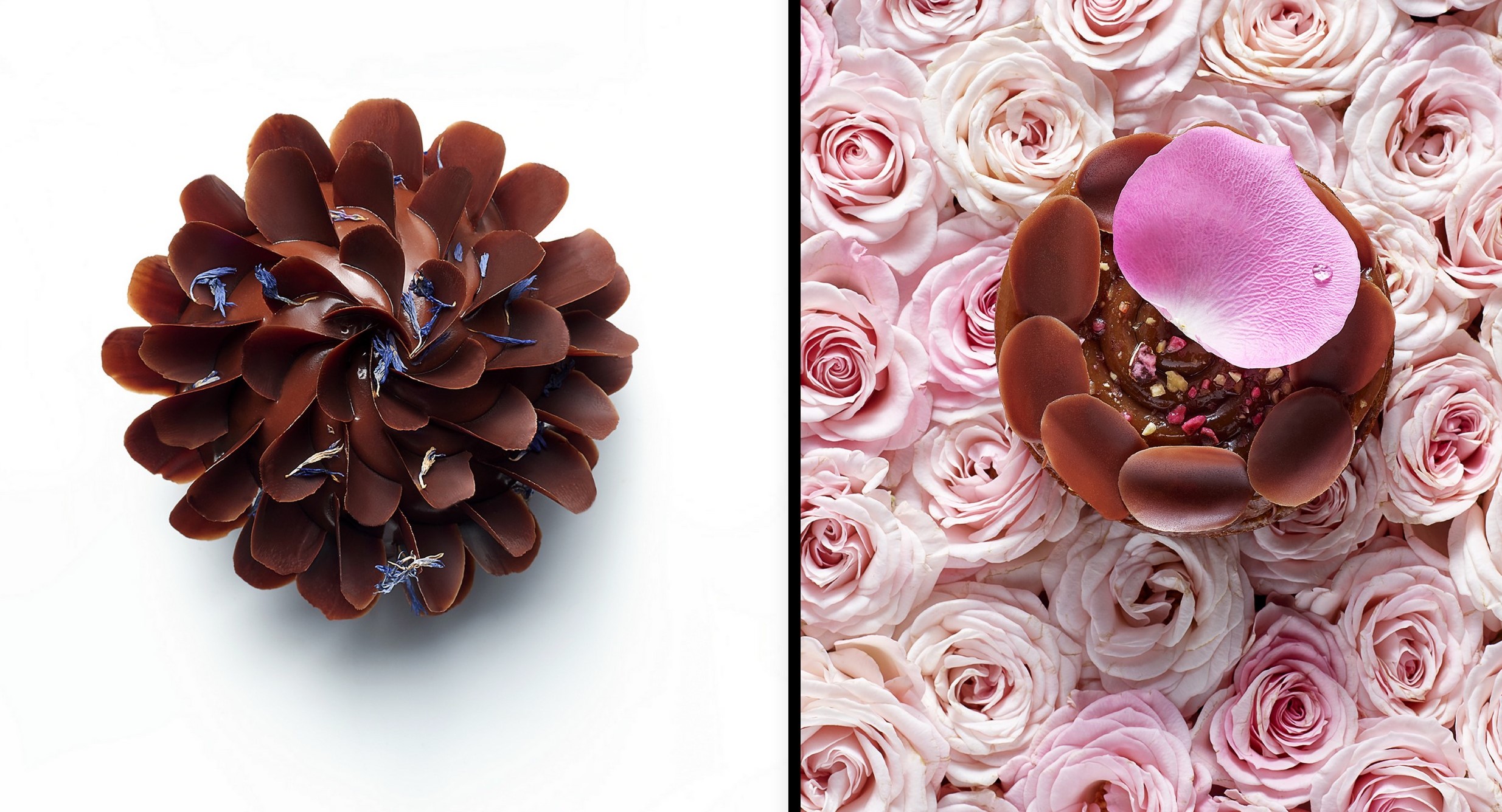 Pour la première fois, Pierre Hermé collabore avec la célèbre Maison du Chocolat pour proposer deux pâtisseries inédites entièrement Vegan (sans ingrédient d’origine animale et sans gluten.). Aussi délicieuses qu’esthétiques, elles s’inspirent des fleurs et se nomment « Fleur de Cassis » et « Rose des sables ». La première se compose d’un sablé au poivre de cassis, d’une compote de cassis à la groseille et jus de citron, d’un chocolat noir pure origine Belize et d’une ganache à l’eau minérale et pulpe de cassis. La seconde mêle le chocolat au lait à la rose mais aussi au praliné amande bien gourmand pour un dessert à la fois caramélisé, torréfié et fleuri. (disponibles à partir du 2 mars). // For the first time, Pierre Hermé is collaborating with the famous Maison du Chocolat to offer two new pastries that are entirely Vegan (without animal ingredients and gluten-free). As delicious as they are aesthetic, they are inspired by flowers and are called « Fleur de Cassis » and « Rose des sables ». The first is composed of a blackcurrant pepper shortbread, blackcurrant compote with redcurrant and lemon juice, pure dark chocolate of Belizean origin and a ganache with mineral water and blackcurrant pulp. The second one mixes milk chocolate with rose but also almond praline for a caramelized, roasted and flowery dessert. (available from 2 March).