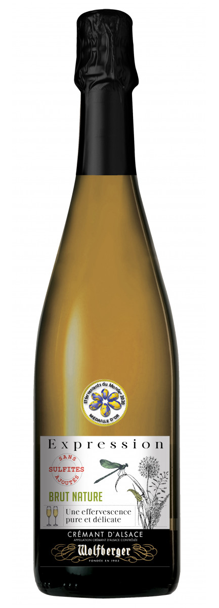 Enfin un Crémant Brut nature et sans sulfites ajoutés pour trinquer sans migraine ! Premier Crémant sans sulfites ajoutés de la Coopérative Alsacienne, le Crémant Expression Brut Nature, médaillé d’or aux Effervescents du Monde 2020 et d’argent aux Vinalies Nationales 2020, est un concentré d’équilibre et de finesse. Non dosé, il exprime avec puissance la nature même du vin. La coopérative Wolfberger s’est attachée à respecter un processus d’élaboration des plus stricts, mobilisant l’ensemble de son savoir-faire. Si ce Crémant nécessite une grande exigence à la production, il n’en demeure pas moins une réussite autant par sa structure qu’au travers de sa palette aromatique entre la mirabelle, la pêche blanche, la coco, la poire, le coing et la noisette. (L’abus d’alcool est déconseillé pour la santé, à consommer avec modération). // Finally a Crémant Brut Nature with no added sulfites to toast without a headache ! The first Crémant without added sulfites from the Alsace Cooperative, Crémant Expression Brut Nature, which won a gold medal at the Effervescents du Monde 2020 and a silver medal at the Vinalies Nationales 2020, is a concentrate of balance and finesse. It is not dosed and expresses with power the very nature of the wine. The Wolfberger cooperative has made a point of respecting a very strict production process, mobilizing all its know-how. If this Crémant requires a great requirement to the production, it remains a success as much by its structure as through its aromatic palette between the mirabelle plum, the white peach, the coconut, the pear, the quince and the hazelnut. (Alcohol abuse is not recommended for your health, consume with moderation).