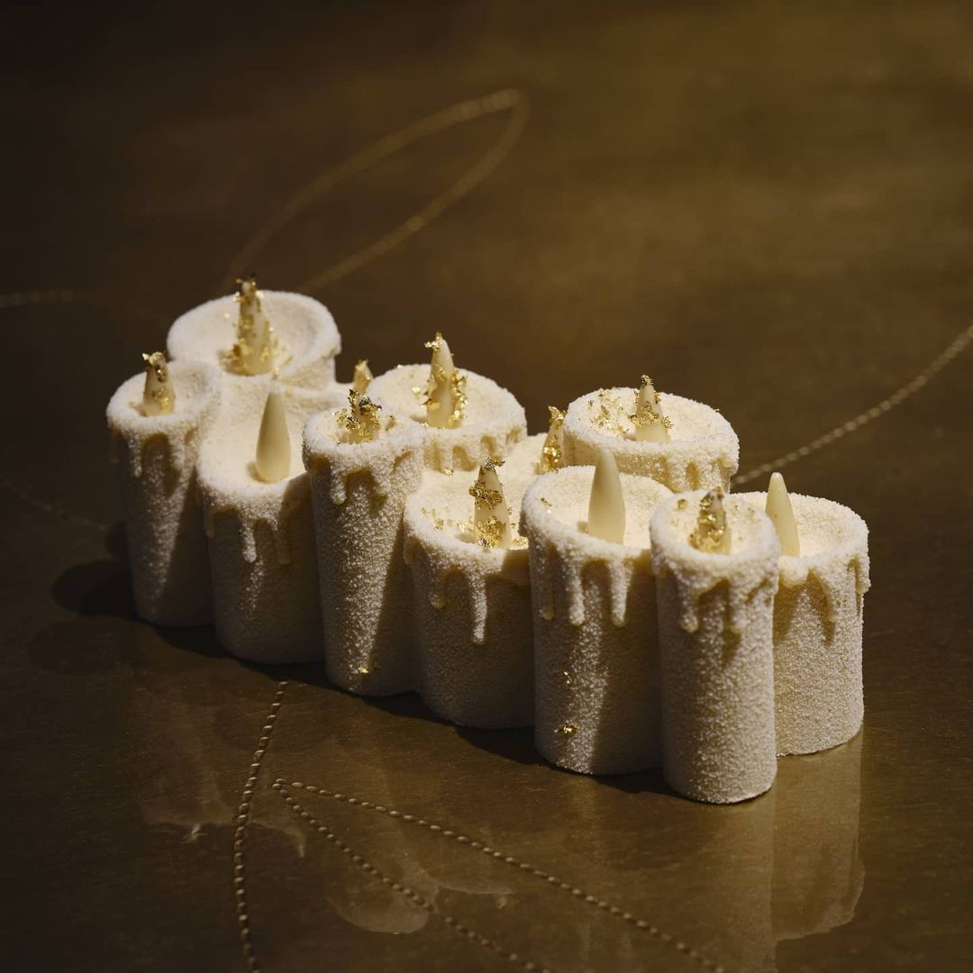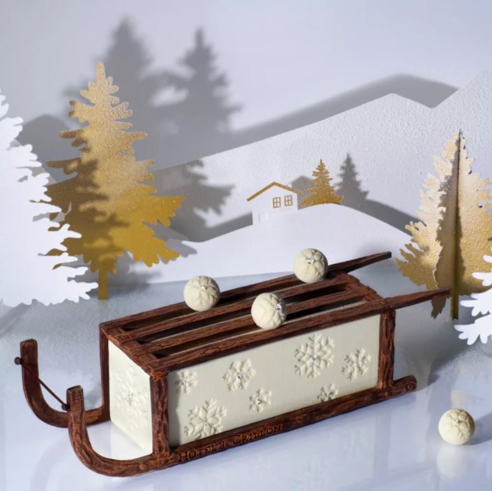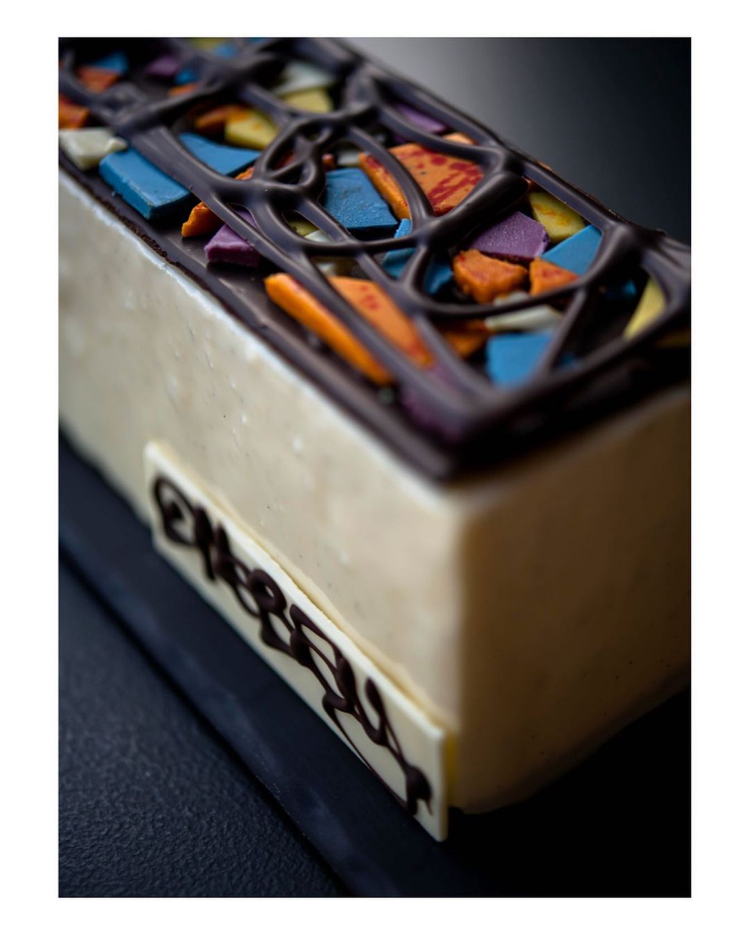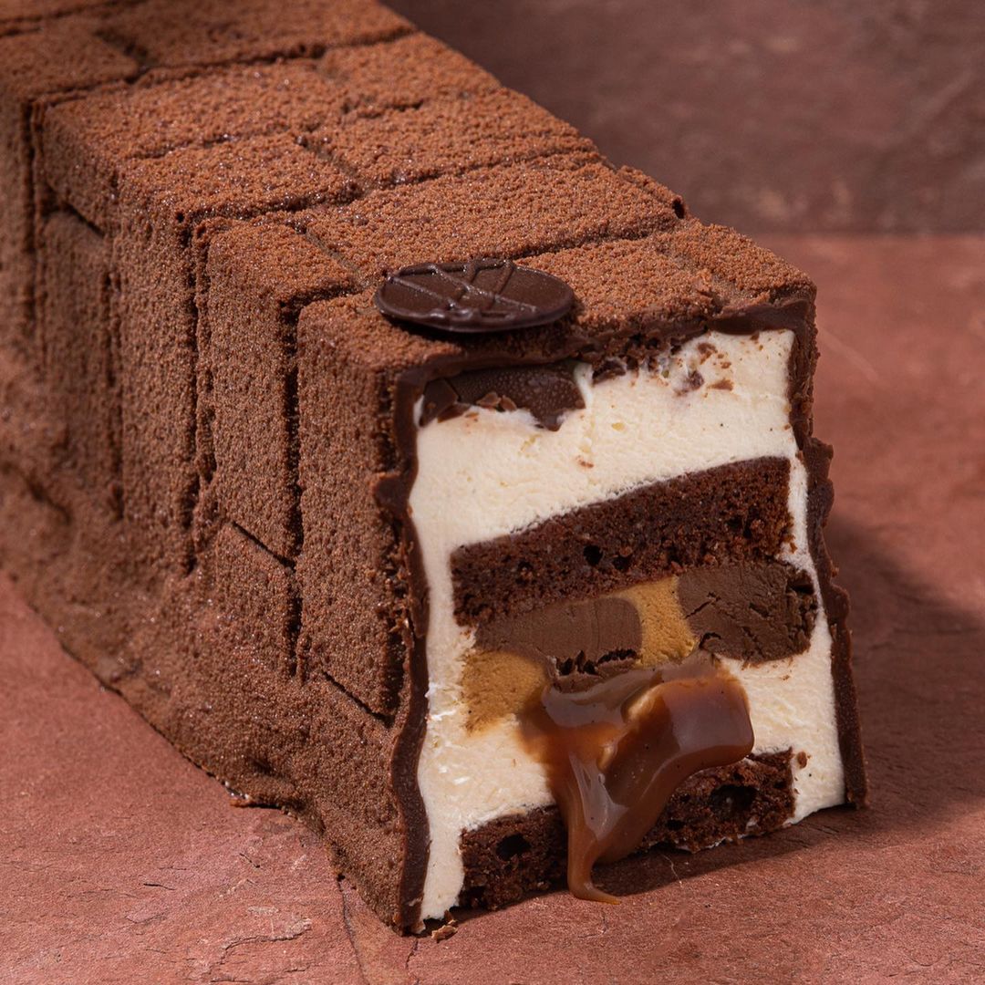 Biscuit dense et moelleux au chocolat Pérou 64% à la fleur de sel – crémeux au caramel – ganache au chocolat à la fève de tonka – Insert coulant au caramel fleur de sel -crème légère à la vanille de Madagascar, coque en chocolat au lait – flocage cacao // Dense and soft cookie with chocolate Peru 64% with fleur de sel – creamy caramel – chocolate ganache with tonka bean – flowing insert with caramel fleur de sel – light cream with Madagascar vanilla, milk chocolate shell – cocoa flocking
