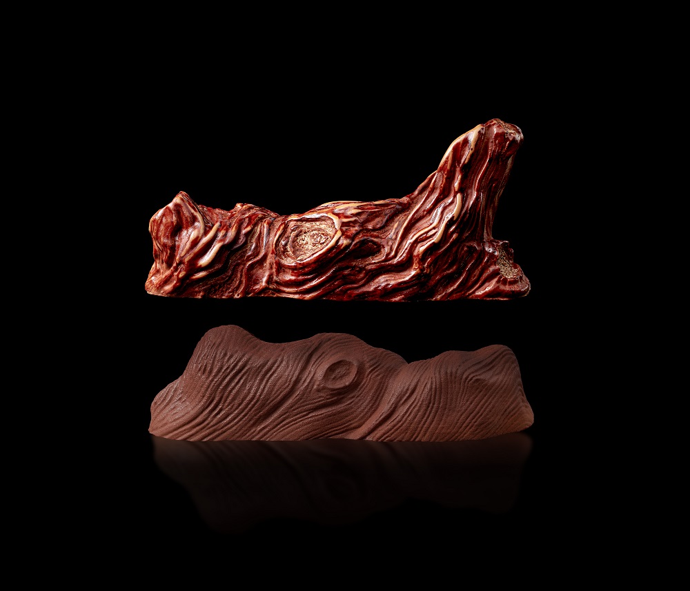 Coque croquante en chocolat – entremet à la ganache vanille infusée à la feuille de pommier grillée – crémeux au lait cru et chocolat de Madagascar fumé au bois de pommier – caramel onctueux aux notes de pomme – biscuit croustillant au cacao // Crunchy chocolate shell – vanilla ganache entremet infused with roasted apple leaf – raw milk cream and Madagascar chocolate smoked with apple wood – smooth caramel with apple notes – crispy cocoa cookie