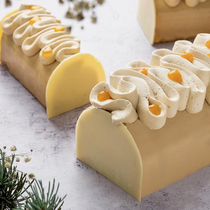 Biscuit financier à l’amande et à la vanille – Biscuit crumble croustillant – mousse dulce de leche – crémeux vif au yuzu – confit de kumquat // Almond and vanilla financier cookie – crunchy crumble cookie – dulce de leche mousse – yuzu creamy – kumquat confit