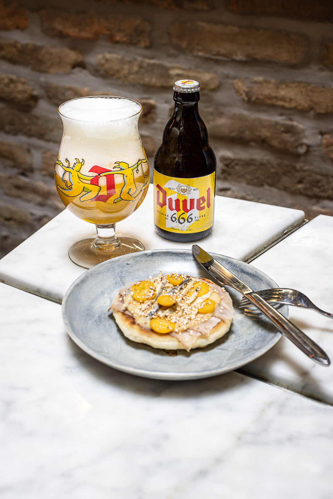 Passé par Top Chef qu’il a marqué de son originalité et bonne humeur, le Chef Baptiste Trudel s’associe à la brasserie familiale belge Duvel en proposant une recette idéale à dévorer accompagnée d’une Duvel 6,66%, une bière blonde, douce et aromatique au titrage diabolique. On se concocte donc quelques flat breads sur lesquels on dépose du lard de Colonnata, une compotée d’oignons à la fleur d’oranger, des kumquats et quelques graines d’amarante soufflées. Le snack ultime pour un apéritif cet été ! (l’abus d’alcool est dangereux pour la santé, à consommer avec modération) // After appearing on Top Chef, which he marked with his originality and good humor, Chef Baptiste Trudel has teamed up with the Belgian family brewery Duvel to offer a recipe that is ideal for devouring with Duvel 6.66%, a sweet and aromatic blonde beer with a devilishly high content. So we concoct a few flatbreads on which we place Colonnata bacon, onion compote with orange blossom, kumquats and a few puffed amaranth seeds. The ultimate snack for an aperitif this summer ! (alcohol abuse is dangerous for your health, consume with moderation).