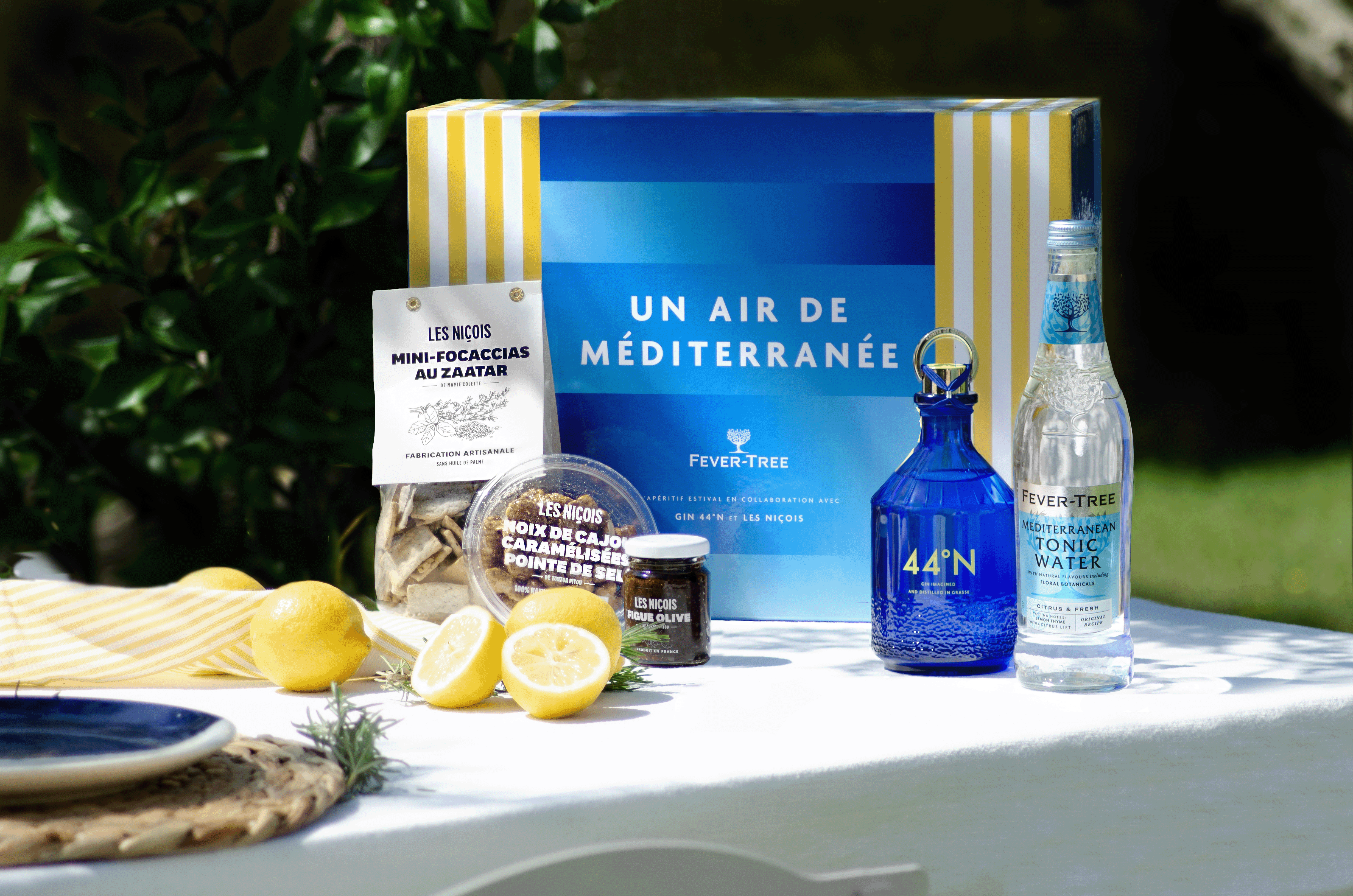 Un coffret idéal pour les amoureux du Sud de la France et ses cigales ! Au programme, un kit complet pour préparer un apéritif estival autour du célèbre cocktail qu’est le Gin Tonic et quelques gourmandises de l’épicerie Les Niçois. À l’intérieur : une bouteille de Fever-Tree Mediterranean Tonic Water, le mixer au thym citron et au romarin qui transporte instantanément en Provence, un sublime flacon contenant du Gin 44°N (le premier à être distillé sur la Côte d’Azur) ainsi que des produits d’épicerie fine du spécialiste de l’apéritif Méditerranéen « Les Niçois » (Mini-focaccias au zaatar, noix de cajou caramélisées à la fleur de sel, tartinable figue/olive). Le meilleur de la French Riviera ! // An ideal gift set for lovers of the South of France and its cicadas ! On the program: a complete kit to prepare a summer aperitif around the famous Gin Tonic cocktail and a few delicacies from Les Niçois grocery store. Inside : a bottle of Fever-Tree Mediterranean Tonic Water, the lemon thyme and rosemary mixer that instantly transports you to Provence, a sublime bottle containing Gin 44°N (the first to be distilled on the Côte d’Azur) and delicatessen products from Mediterranean aperitif specialist Les Niçois (Mini-focaccias with zaatar, caramelized cashews with salt flower, fig/olive spread). The best of the French Riviera !