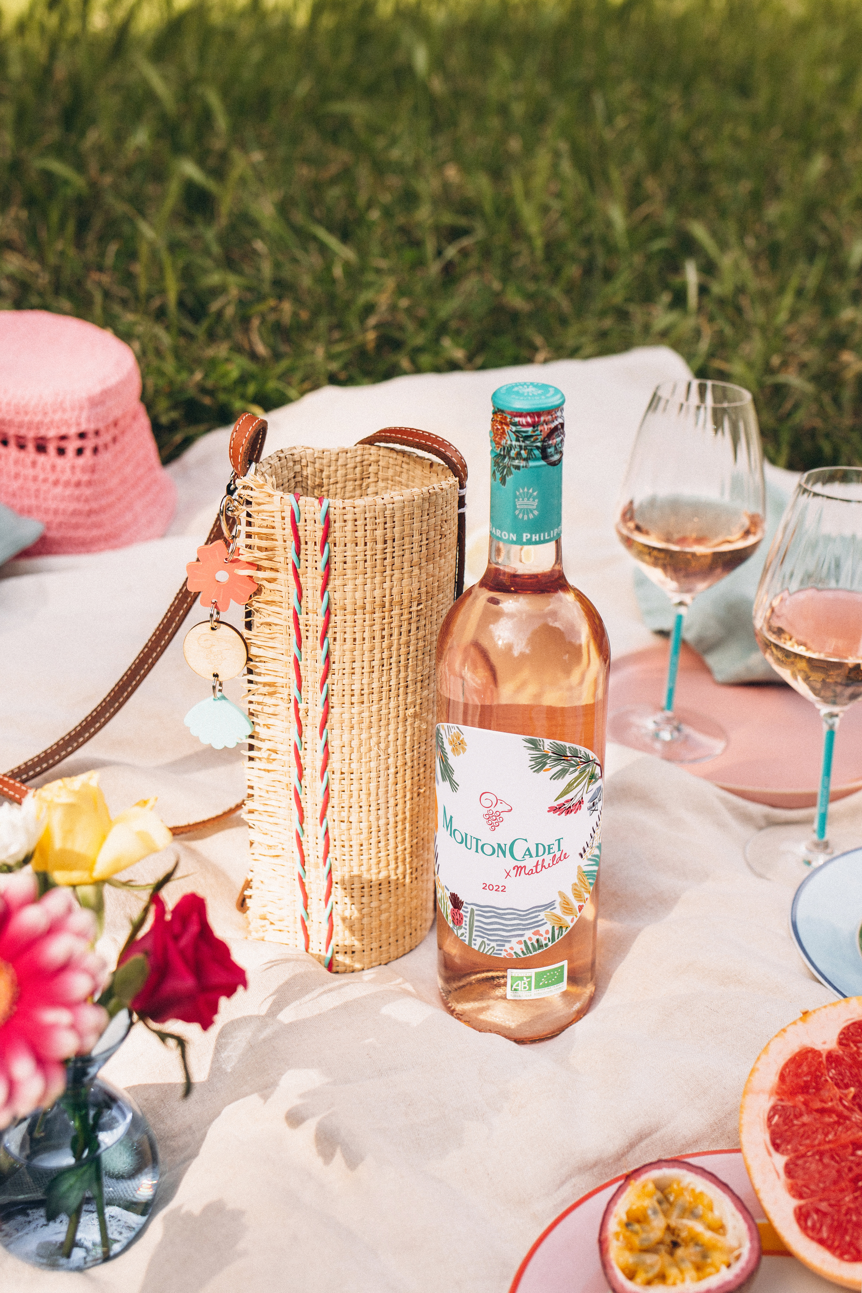 Coup de cœur pour cette nouvelle cuvée et son accessoire de choc : un adorable sac porte-bouteille signé Astrid Eudeline (Little Anana), une créatrice basque. En raphia, scoubidous acidulés et anse de cuir végétal, avec son porte-clé reprenant le Barbacchus iconique de la marque, entièrement conçu et fabriqué à Paris, il vous permet de garder votre bouteille au frais pour un look bohème chic intemporel (doublure réfrigérante). Le millésime 2022 Mouton Cadet Rosé x Mathilde est toujours aussi frais, tirant son nom de Mathilde Sereys de Rothschild, arrière-petite-fille du baron Philippe de Rothschild qui a participé à l’assemblage de ce rosé gourmand. Issu d’une sélection minutieuse de parcelles cultivées en Agriculture Biologique chez 7 vignerons partenaires, certifié biologique et vegan, ce rosé est riche en arômes de fruits rouges frais, groseille et framboise et s’ouvre sur des notes de pamplemousse qui viennent rafraîchir le palais et se fondre ensuite sur une fin de bouche intense et minérale marquée par la délicatesse des fruits exotiques. // We’ve fallen in love with this new vintage and its striking accessory : an adorable bottle-holder bag designed by Astrid Eudeline (Little Anana), a Basque designer. Made from raffia, colorful scoubidous and vegetable leather handles, with a keyring featuring the brand’s iconic Barbacchus, entirely designed and made in Paris, it keeps your bottle cool for a timeless bohemian chic look (cooling lining). The 2022 Mouton Cadet Rosé x Mathilde vintage is as fresh as ever, taking its name from Mathilde Sereys de Rothschild, great-granddaughter of Baron Philippe de Rothschild who helped blend this gourmet rosé. Produced from a meticulous selection of plots cultivated organically by 7 partner winegrowers, certified organic and vegan, this rosé is rich in aromas of fresh red fruit, redcurrant and raspberry, opening with notes of grapefruit that refresh the palate and then melt into an intense, mineral finish marked by the delicacy of exotic fruit.