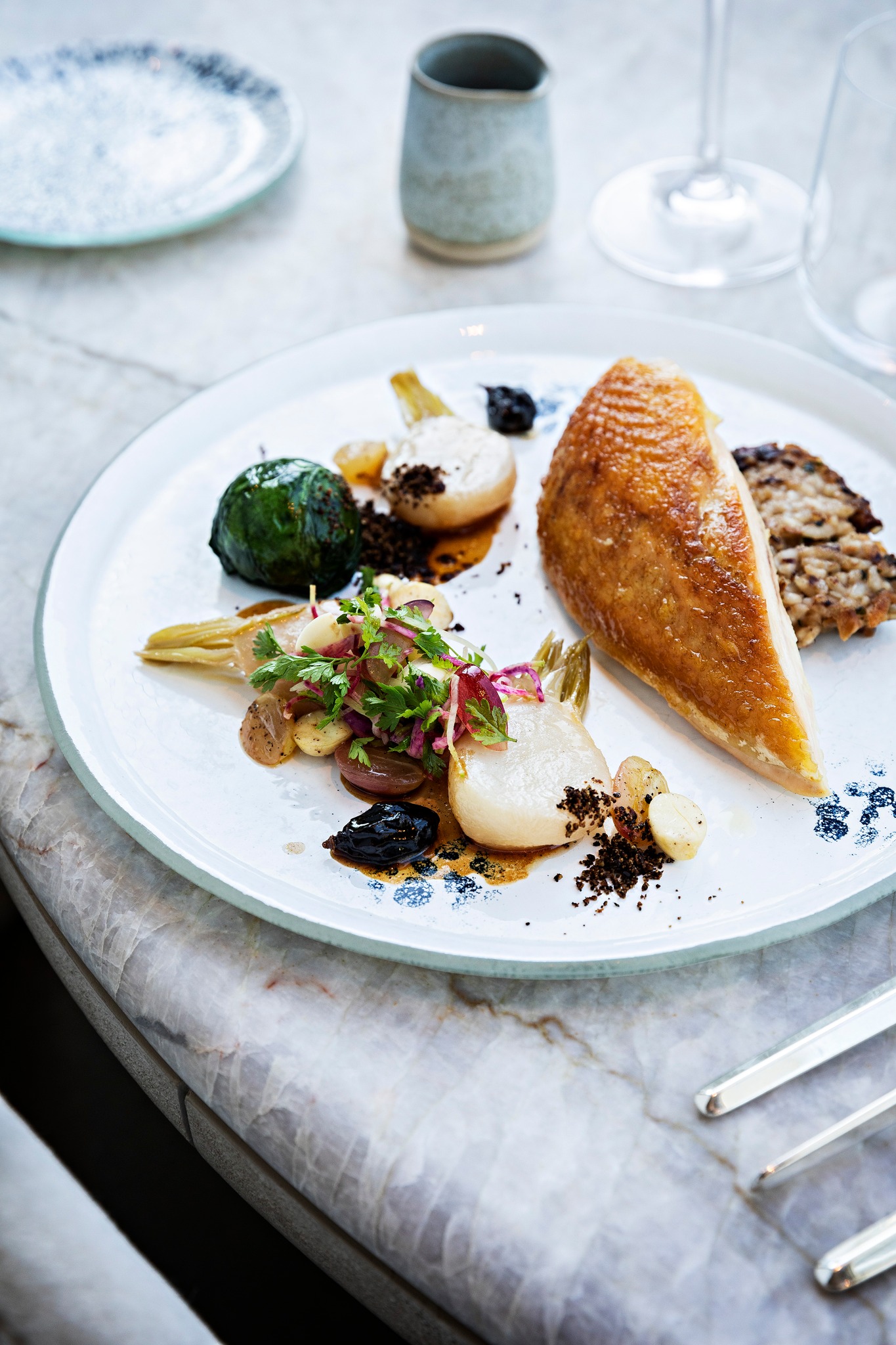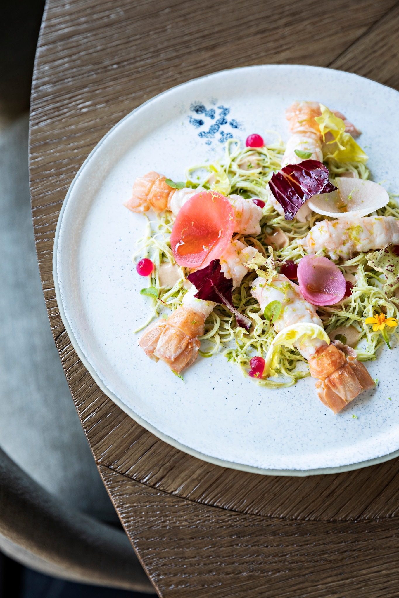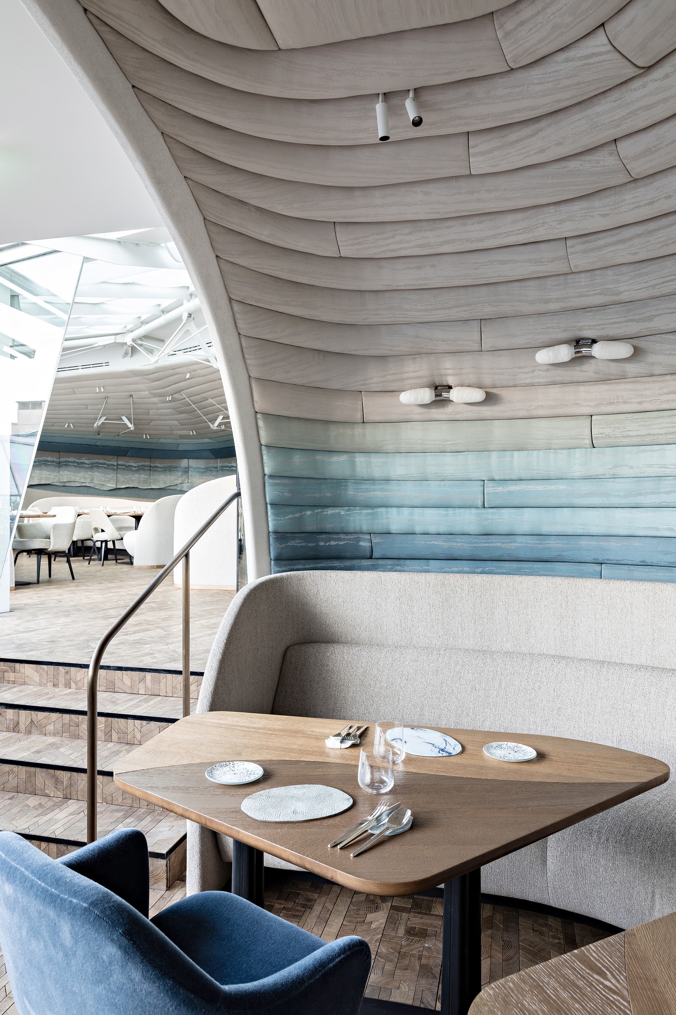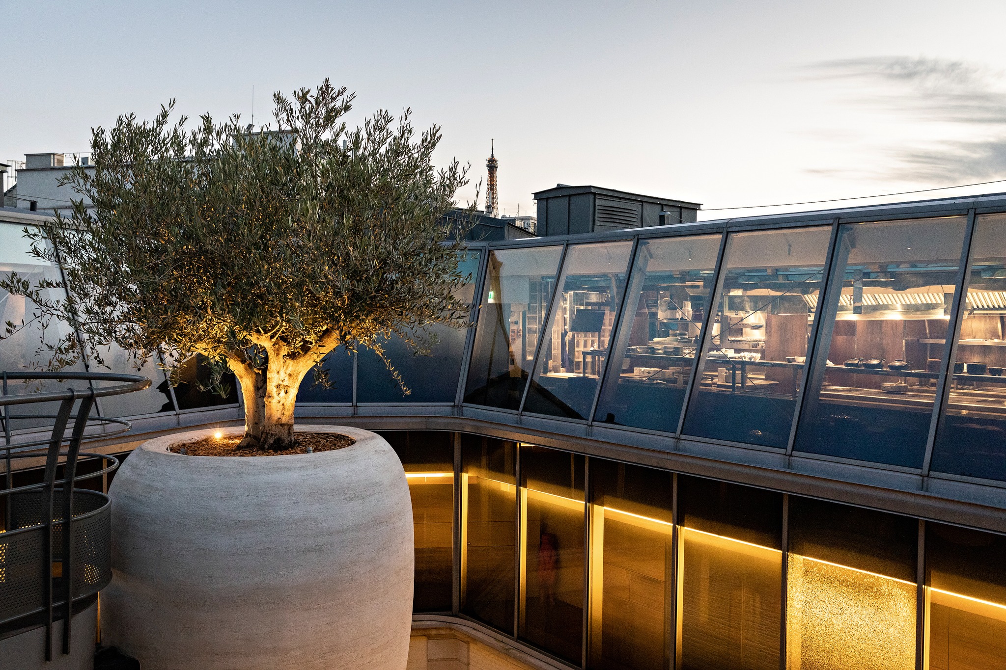 S’offrir un déjeuner ou un dîner gastronomique au cœur du Triangle d’Or parisien, c’est la promesse d’une parenthèse inoubliable en amoureux, en famille ou entre amis. Pour une expérience mémorable, on réserve une table au 39V, le superbe cocon perché sur les toits de l’avenue George V du Chef Frédéric Vardon. Ce Chef renommé, fils de charcutiers-traiteurs et compagnon de route d’Alain Ducasse, sait comment sublimer les produits frais et nobles du terroir français au sein de ce restaurant confidentiel occupant tout le sixième (dernier) étage. La quête des meilleurs produits respecte une démarche éthique à travers la maîtrise des circuits courts et la vérification des origines. Une attention toute particulière est apportée à la compréhension du lien entre environnement et production avec un focus sur l’attention du bien-être animal de la naissance à leur fin de vie. Côté design, il s’agit de l’un des plus jolis restaurants de Paris grâce au talent de Raphaël Navot dont on retrouve les codes dès le sas d’entrée avant de s’engouffrer dans l’ascenseur qui nous mènera au spectaculaire dernier étage. Comme en apesanteur, la salle de restaurant fait face aux cuisines que l’on aperçoit à travers les baies vitrées, au même titre que la pointe de la Tour Eiffel : un magnifique spectacle panoramique de nuit ! On est fan de cet écrin façon boudoir, comme une arène baignée par la lumière naturelle, avec son parquet en bois de chez Oscar Ono, ses alcôves intimistes, ses murs semi-sphériques texturés bleu-grisés, ses banquettes sur-mesure habillées par la Maison Gohard, ses tables en chêne massif réalisées par la Maison Lefrançois, son bar imposant en bois texturé, sa cave à vin vitrée abritant plus de 2 000 bouteilles… Le restaurant dispose également d’une petite terrasse en teck pour fumer son cigare, siroter un cocktail original, un jus de cranberry infusé, ou pour les soirées privées à l’approche des beaux jours. Le chef Frédéric Vardon y a également conservé son jardin avec herbes variées, plantes aromatiques et quelques agrumes. Au menu, une gastronomie authentique, sincère, durable et réalisée dans le respect des traditions culinaires françaises : gourmande en toute simplicité. La plupart des entrées se déclinent en petit modèle ou dans un format hors d’œuvre de dégustation. Tous les mardis, un menu déjeuner est proposé selon les retours du marché, et pour les plus petites envies, des compositions froides dans l’esprit de grandes salades peuvent être suggérées. On aime aussi les gougères pour patienter, les accords de saison à l’image des alliances champignons/châtaignes/foie gras, les Saint-Jacques crues de Normandie, le tourteau de Boulogne-sur-mer, le filet de bœuf de race avec ses pommes Dauphine et sa sauce au poivre ou encore la pêche durable en fonction du retour des criées. Sans oublier les surprises, les trésors de nos régions dans la catégorie « Hors carte » : la chasse de plumes et de poils selon les arrivages ; un king crabe de casier à partager, un loup pour 3 à 4 convives simplement rôti à la broche… Côté desserts, le Chef prouve à nouveau l’étendue de son talent avec des soufflés incontournables (maïs doux/pamplemousse/pop corn), des glaces maison à se damner (pollen et praliné croustillant addictif par exemple), des « Parisiennes » maîtrisées (canelé, éclair au cacao, Paris-Brest) et autres gourmandises. Un véritable ovni. // A gourmet lunch or dinner in the heart of Paris’ Golden Triangle promises an unforgettable interlude for lovers, family or friends. For a memorable experience, book a table at Le 39V, Chef Frédéric Vardon’s superb cocoon perched on the rooftops of Avenue George V. This renowned chef, son of pork butchers and Alain Ducasse’s fellow traveler, knows how to best sublimate the fresh, noble products of the French terroir in this confidential restaurant occupying the entire sixth (top) floor. The quest for the finest produce is ethically sound, with a focus on short supply chains and verifying origins. Particular attention is paid to understanding the link between environment and production, with a focus on animal welfare from birth to end of life. In terms of design, this is one of the prettiest restaurants in Paris, thanks to the talent of Raphaël Navot, whose codes can be seen right from the entrance hatch before entering the elevator to the spectacular top floor. As if weightless, the dining room faces the kitchens, which can be seen through the bay windows, just like the tip of the Eiffel Tower : a magnificent panoramic view at night ! We love this boudoir-like setting, like an arena bathed in natural light, with its Oscar Ono wood flooring, intimate alcoves, blue-grey textured semi-spherical walls, made-to-measure banquettes by Maison Gohard, solid oak tables by Maison Lefrançois, imposing textured wood bar, glassed-in wine cellar housing over 2,000 bottles… The restaurant also boasts a small teak terrace where you can smoke your cigar, sip an original cocktail or infused cranberry juice, or enjoy a private evening as the sun comes out. Chef Frédéric Vardon has also preserved his garden with a variety of herbs, aromatic plants and a few citrus fruits. On the menu, authentic, sincere, sustainable gastronomy in keeping with French culinary traditions : gourmet and simplicity. Most starters are available in small or hors d’oeuvre tasting formats. Every Tuesday, a lunch menu is proposed according to market returns, and for smaller desires, cold compositions in the spirit of large salads can be suggested. Other highlights include gougères to tide you over, seasonal pairings such as mushrooms/chestnuts/foie gras, raw scallops from Normandy, Boulogne-sur-mer crab, filet of purebred beef with pommes Dauphine and pepper sauce, and sustainable fishing according to market returns. And let’s not forget