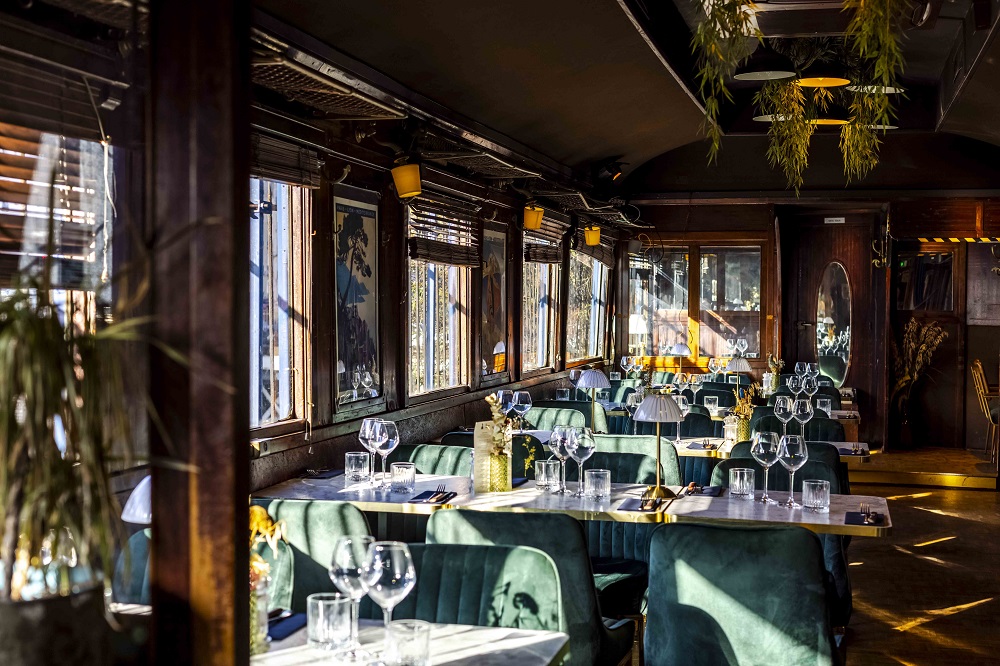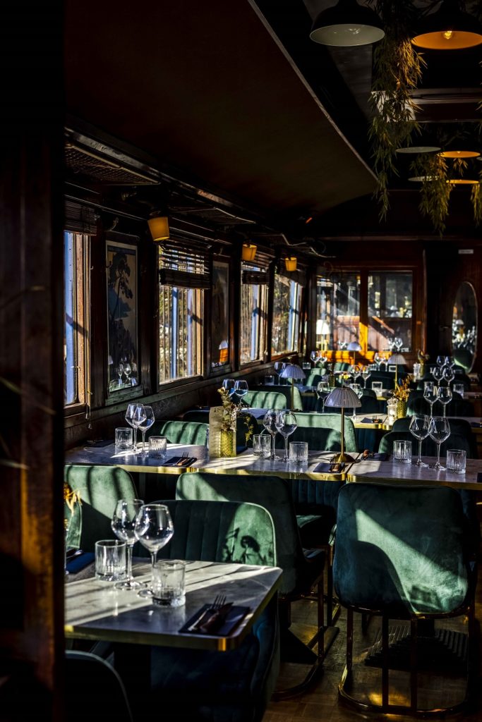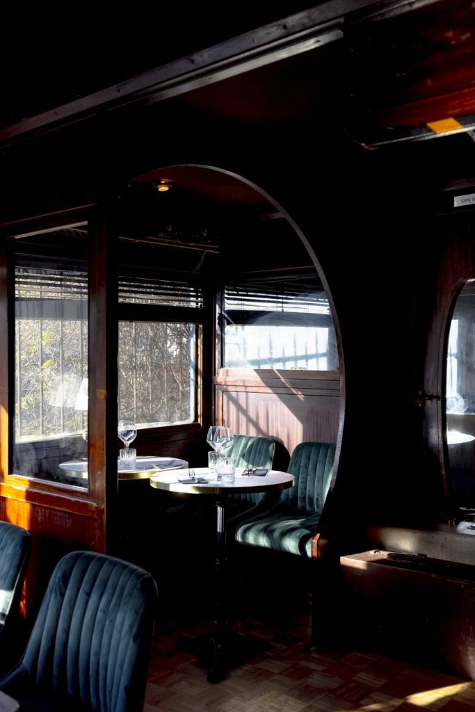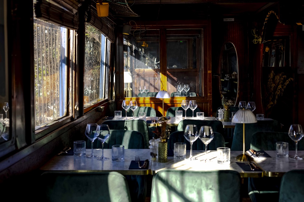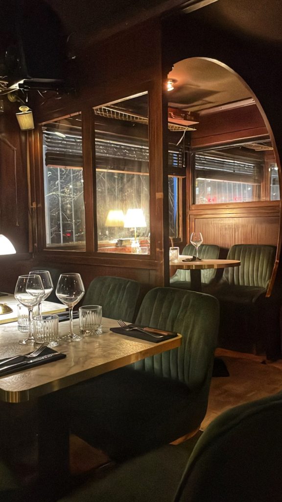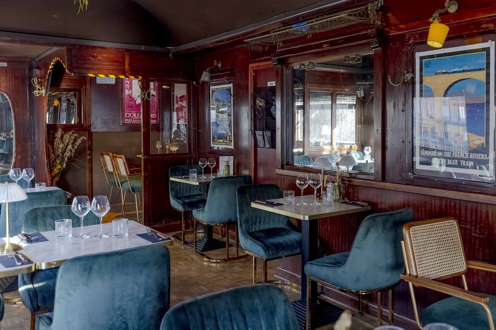 A quelques pas du métro Rome (quartier Batignolles), surplombant les voies ferrées du 17ème arrondissement, se trouve le Wagon Bleu, une institution qui a récemment fait peau neuve. Désormais, on s’y attable en couple, en famille ou entre amis pour profiter de ce superbe décor tout en dégustant une cuisine aux accents corses. Caché derrière un bar de quartier animé, on tire un rideau pour se retrouver dans un authentique wagon de l’Orient Express de 1925. Effet vintage garanti dans cette salle de restaurant digne d’un décor de film avec ses affiches anciennes, ses boiseries, ses fauteuils en velours vert et lumières tamisées. Au rythme de la musique corse, on commence par quelques cocktails originaux à l’image du mojito du Cap Corse, du Basilic express ou du câlin à Palombaggia, un délicieux cocktail sans alcool rendant hommage à la célèbre plage avec son jus d’orange/jus de cranberry et sirop de pêche. A la carte, des propositions gourmandes et très généreuses. En entrée, à partager ou non, on retrouve un houmous pimpé à la châtaigne et aux noisettes corses, un divin poulet frit « Korsican Fried chicken » ultra fondant, des beignets de fromage de chèvre frais et fermier ou encore des boulettes du fameux brocciu. Côté plats, un addictif effiloché de porc sucré salé à la figue, un magret de canard relevé par un jus réduit à la bière corse (Pietra Rossa), un adorable potimarron farci (champignons, quinoa, châtaignes, miel) pour les végétariens mais aussi une carbonara à la corse, sans crème mais avec de la tomme et de la Bulagna (joue de cochon corse). Les accompagnements vont des frites maison au gratin dauphinois en passant par la purée. Les desserts ne manquent pas de gourmandise entre tiramisu au canistrelli, Pastizzu (se mange sans faim, entre le flan, le gâteau de semoule et la crème caramel avec son caramel de clémentine maison) ou encore le pain paysan perdu à la nucciola. Incontournable. // Just a stone’s throw from the Rome metro station (Batignolles district), overlooking the railroad tracks of the 17th arrondissement, is the Wagon Bleu, an institution that has recently undergone a facelift. Now, couples, families and friends can enjoy the superb décor and Corsican-style cuisine. Hidden behind a lively neighborhood bar, we pull back a curtain to find ourselves in an authentic 1925 Orient Express carriage. Vintage effect guaranteed in this restaurant worthy of a film set, with its old posters, wood panelling, green velvet armchairs and subdued lighting. To the rhythm of Corsican music, we start with a few original cocktails like the Cap Corse mojito, the Basilic express or the hug at Palombaggia, a delicious non-alcoholic cocktail paying tribute to the famous beach with orange juice/cranberry juice and peach syrup. The à la carte menu features generous, gourmet offerings. Starters, to share or not, include a hummus with chestnuts and Corsican hazelnuts, a divine “Korsican Fried Chicken”, ultra-melting fried chicken, farm-fresh goat’s cheese fritters and dumplings of the famous brocciu. Dishes include an addictive sweet and savory pork effiloché with fig, a duck breast with a Corsican beer reduction (Pietra Rossa), an adorable stuffed pumpkin (mushrooms, quinoa, chestnuts, honey) for vegetarians, and a Corsican-style carbonara, without cream but with tomme and Bulagna (Corsican pig cheek). Side dishes range from home fries to gratin dauphinois and mashed potatoes. Desserts include tiramisu with canistrelli, Pastizzu (eaten without hunger, between flan and semolina cake with homemade clementine caramel) and French toast with nucciola. Not to be missed.