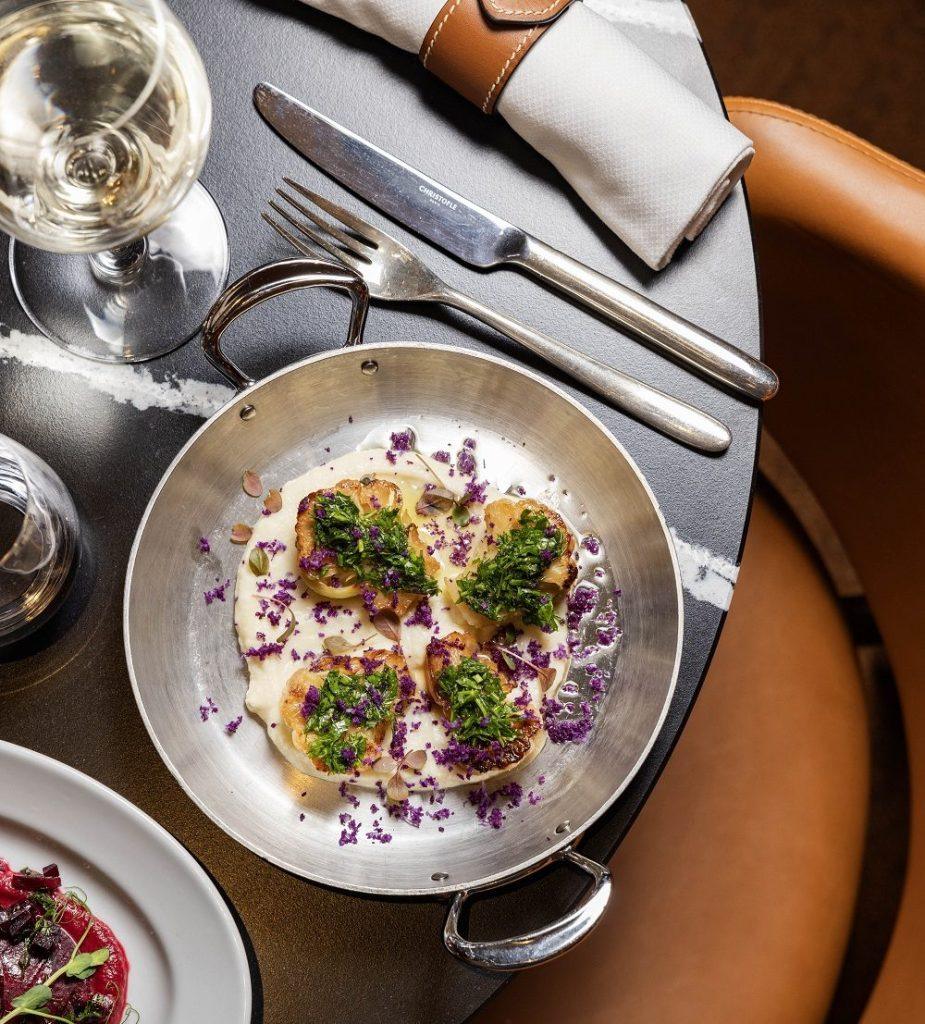 On commence subtilement le repas par les ravioles de betterave farcies de crème fromagère aux noix de pécan et coulis de betterave ou les choux-fleurs braisés au miel, crémeux de chou-fleur et noisettes torréfiées. On poursuit avec les gnocchis de potimarron, crémeux de butternut et graines de courges torréfiées ou avec les classiques revisités comme le fish & chips londonien aux épices avec son écrasé de petits pois. Le tout à accompagner de frites maison ou d’une délicieuse cassolette de champignons.